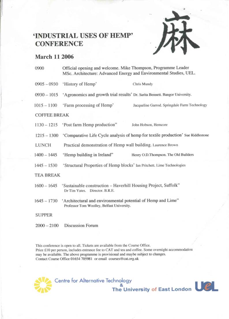 Henry Thompson has been a regular speaker and demonstrator for Hemp and Lime works at the CENTRE FOR ALTERNATIVE TECHNOLOGY GRADUATE SCHOOL OF THE ENVIRONMENT for their MSc Architecture: Advanced Environmental and Energy Studies MSc Renewable Energy and the Built Environment.